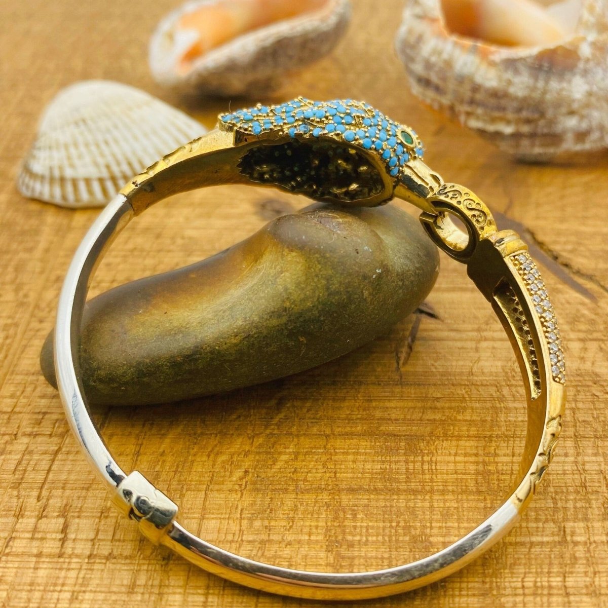 مجوهرات تركية يدوية الصنعهذه الإسوارة الفضية 925 تتميز بحجر الفيروز النابض بالحياة وتصميم جريء لنمر. مثالية لمحبي المجوهرات ذات الطابع الحيواني، وهي هدية رائعة لها.